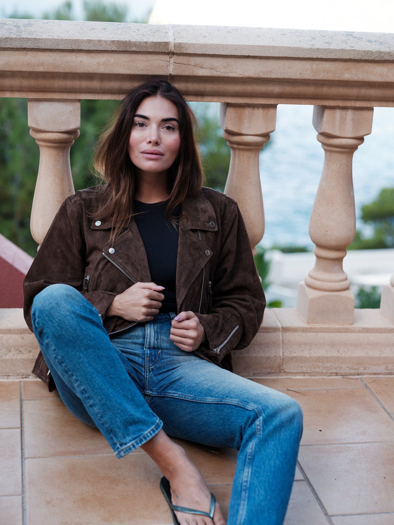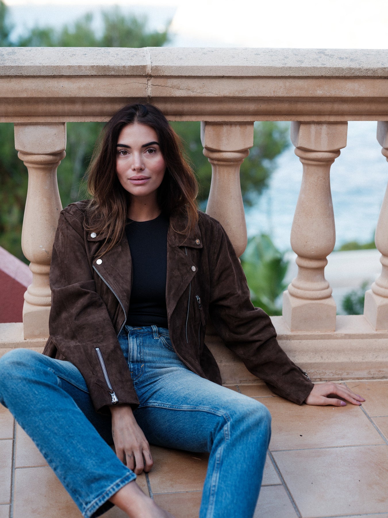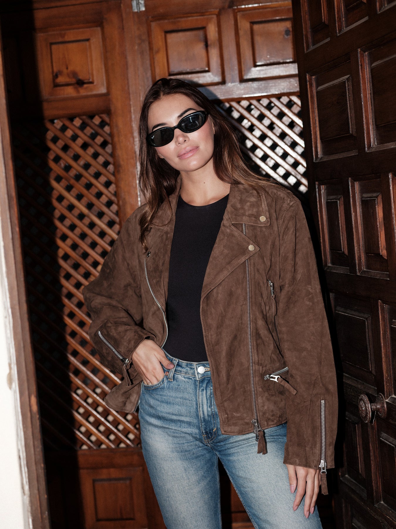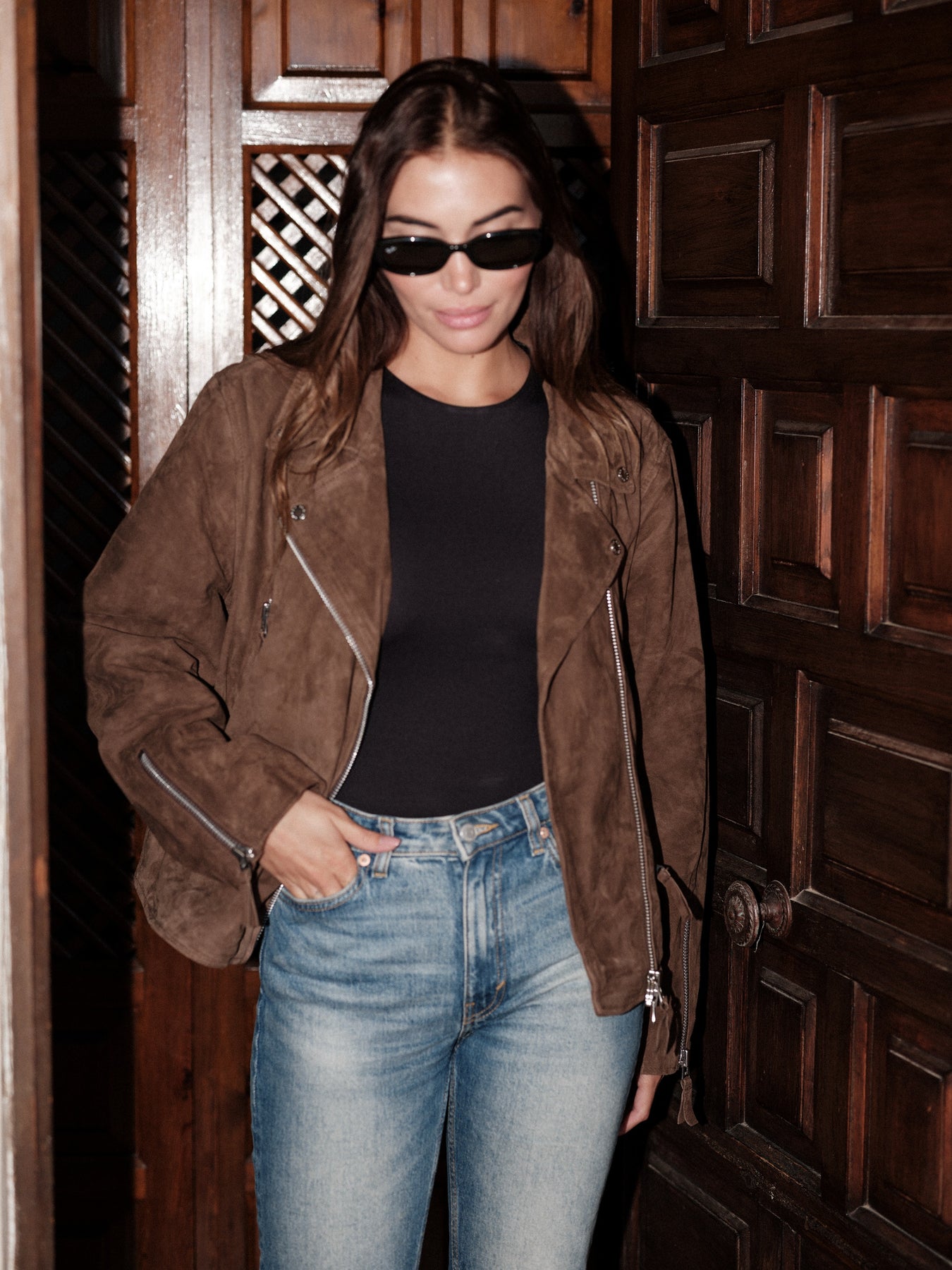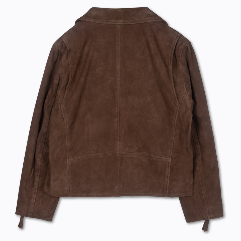 Relaxed soft goat suede biker with satin lining.