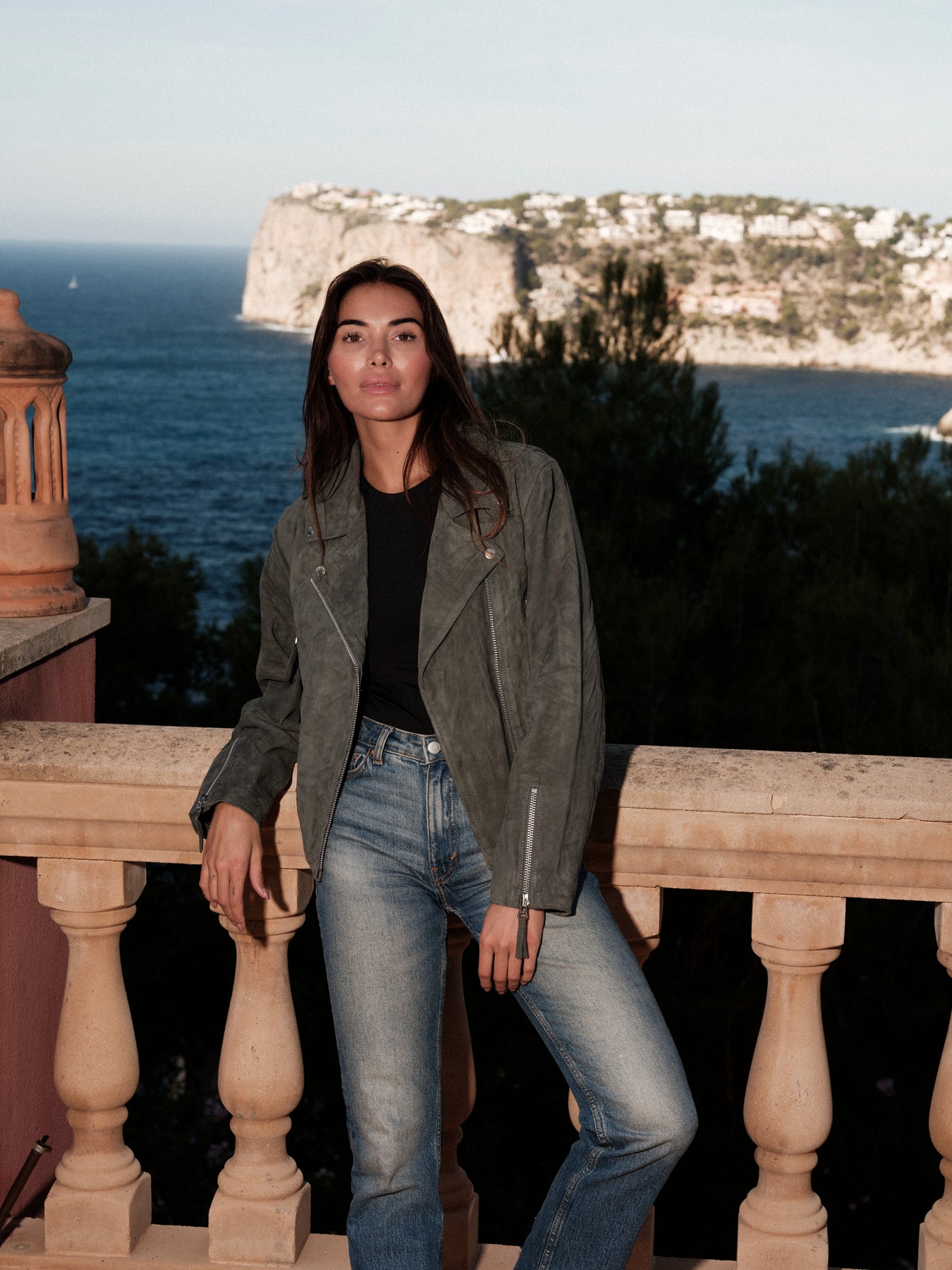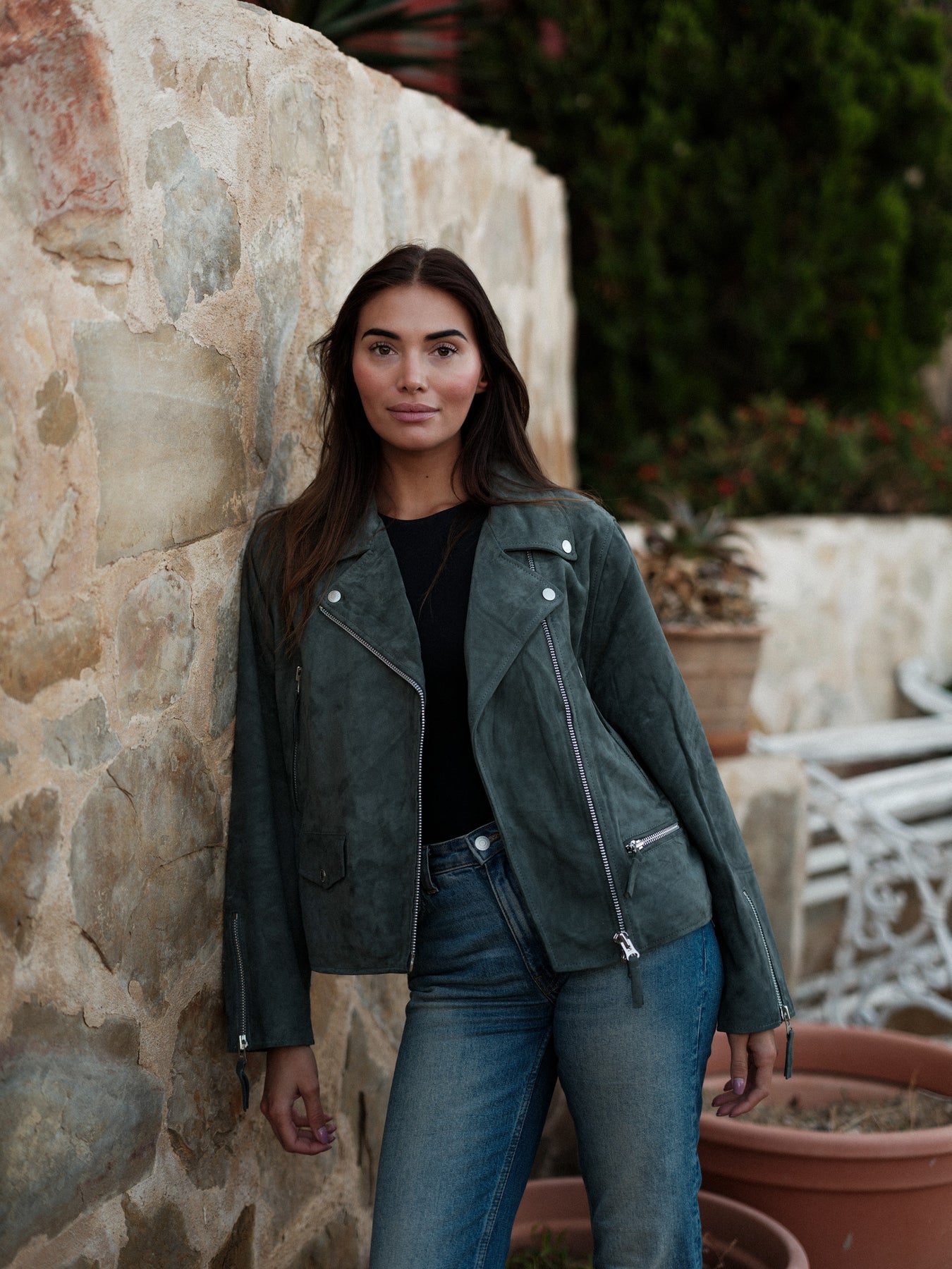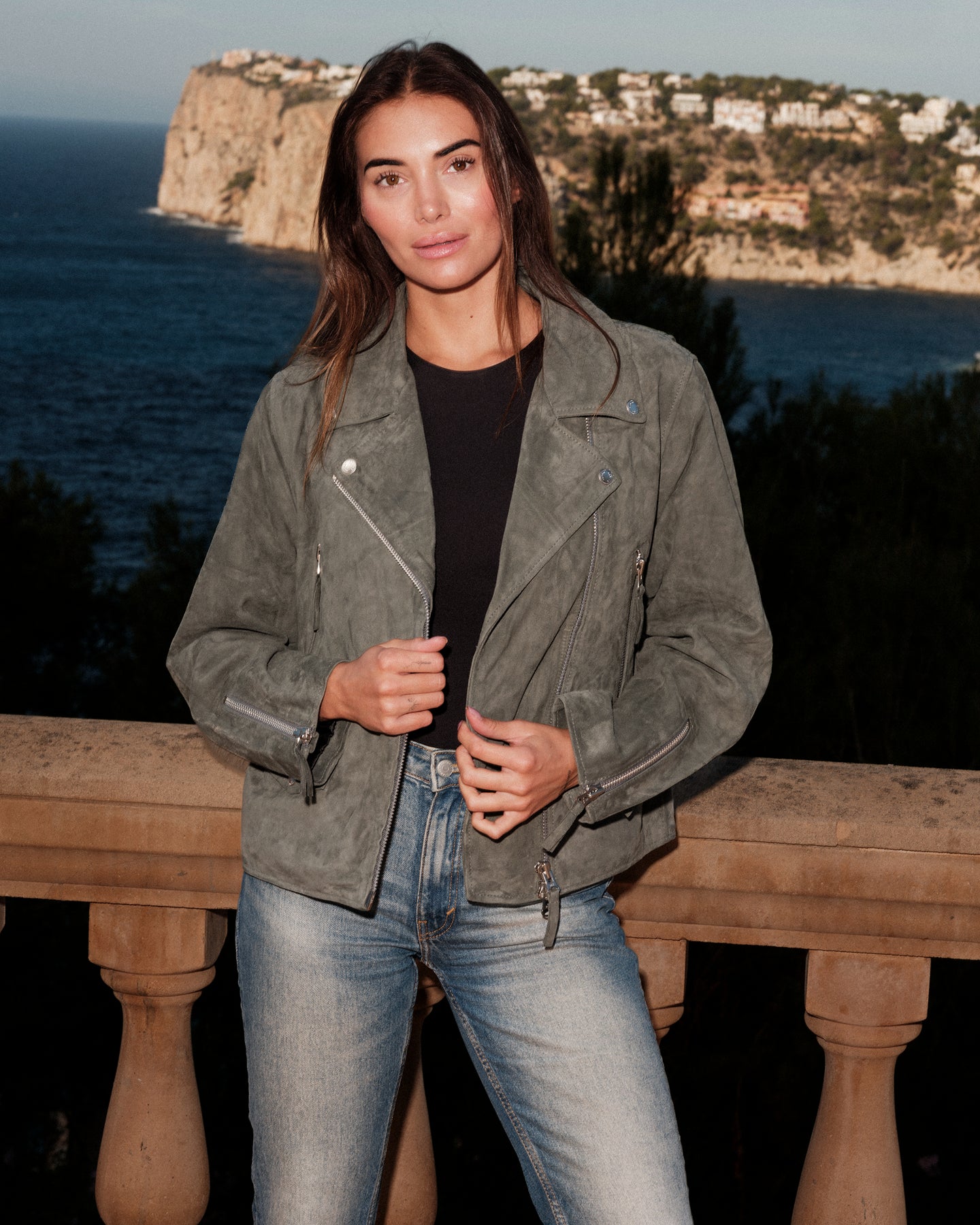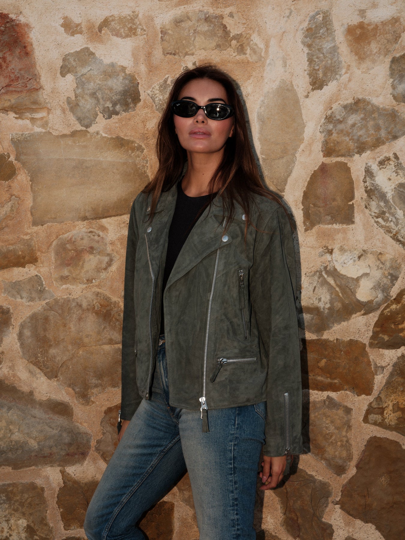 Ellen biker in soft goat suede with black satin lining and two way ykk logo zippers.